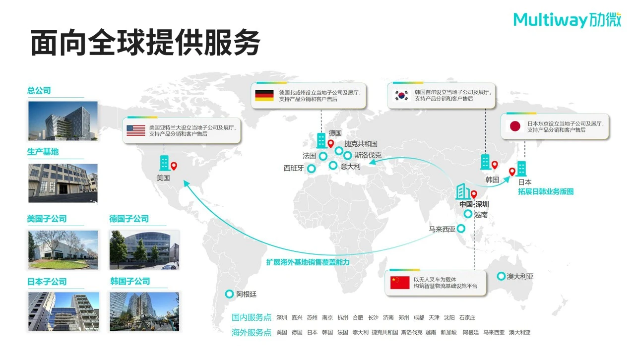 劢微机器人成立于2019年,总部位于深圳光明,并在深圳、杭州、厦门、桐乡等地设有区域子公司,同时在美国亚特兰大、德国北威州、日本东京与韩国首尔等国际市场设立分支机构,业务覆盖全球30多个国家和地区。劢微机器人专注提供基于机器人与人工智能技术的智能制造及智能物流解决方案,客户群体涵盖机械制造、食品饮料、冶金材料、化工能源、汽车制造、冷链物流等多个重点行业。其核心客户包括中国航天、中国平煤、中国商飞、中国一汽、国家电网、海尔、空中客车AIRBUS、日本住友SUMITOMO、韩国三星SAMSUNG、韩国LG、韩国韩华、艾默生Emerson等全球知名企业,目前已累计服务超过700家客户。
