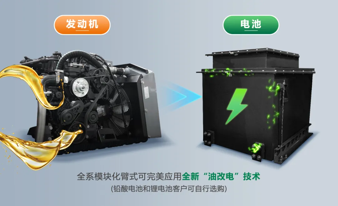 凡鼎力模块化柴动臂式,均适用于此次“油改电”技术,整机只需将柴动模块全套更换为电动模块,即可得得到一个全新“心脏”!